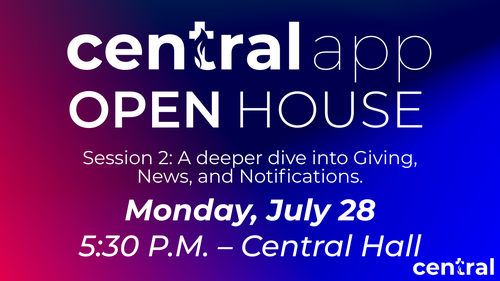This week, we’re continuing with our Central App Open Houses! Join us NEXT Monday, July 28 at 5:30 P.M. in Central Hall for a second session, including a deeper dive into giving, news, and notifications. You are strongly encouraged to join us, even if you feel comfortable with the app as we will be exploring many important features! This is a great chance to connect, learn, and make the most of the tools we’ve created to bring our church family closer together.