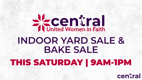 The United Women in Faith Indoor Yard Sale & Bake Sale is THIS SATURDAY, July 26, 2025 from 9:00 A.M. to 1:00 P.M. in the Family Life Center. All proceeds will go towards Central's Missions. If you have any questions, reach out to the church office. See you Saturday!