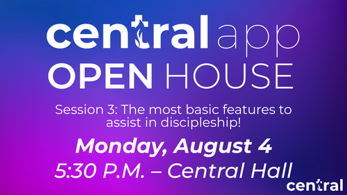 This week, we’re continuing with our Central App Open Houses! Join us THIS Monday, August 4 at 5:30 P.M. in Central Hall for a third session, including a tour of the app and its most basic features to assist you in your discipleship! You are strongly encouraged to join us, even if you feel comfortable with the app as we will be exploring many important features! This is a great chance to connect, learn, and make the most of the tools we’ve created to bring our church family closer together.