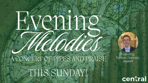 Join Nathan Clements, organist THIS SUNDAY, August 3, 2025 at 5:00 P.M. for an evening full of the majestic sounds of Central's 3-manual, 41-rank Casavant Pipe Organ! Enjoy works by Bach, Mendelssohn, Handel, Purcell, and others! There will be quite a few hymn arrangements also! Hope to see you there! Refreshments will be provided at the conclusion of the concert!