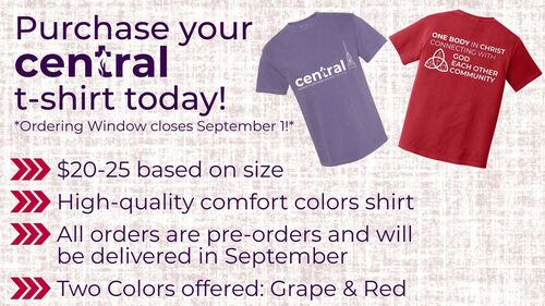 Don’t miss out! Order yours today by clicking the button below and represent Central in style! If you are unable to purchase your t-shirt online, please call the church office to place your pre-order.