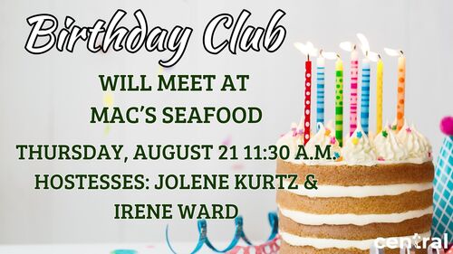 Join us for great food and even better fellowship at our next Birthday Club meeting on Wednesday, August 21 at 11:30 A.M. We’ll gather at Mac’s Seafood to celebrate birthdays and enjoy time together. Whether it’s your birthday month or not, all are welcome!