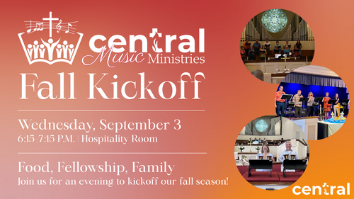 Come be part of a special evening as we begin a new season of music at Central! Join us on Wednesday, September 3, from 6:15 to 7:15 p.m. in the Hospitality Room for food, fellowship, and family. This is a chance to reconnect after the summer, enjoy time together, and learn more about the opportunities in our music ministries this fall.