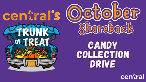 Start stocking up on Halloween candy for October's Shareback Opportunity - Central's Trunk or Treat! Collection will begin on October 1!