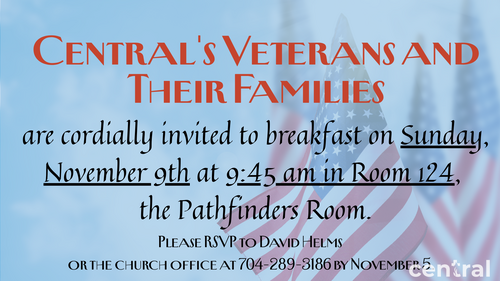 Are you or someone in your family a Veteran? We would like to honor all Central's Veterans on Sunday, November 9th with a breakfast at 9:45 am in Room 124, the Pathfinders Room.