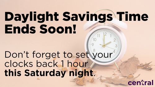 Don’t forget to set your clocks back the evening of Saturday, November 1.