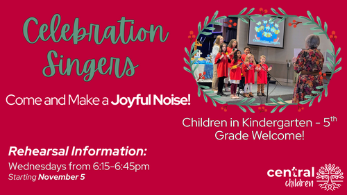 Children in Kindergarten through fifth grade are welcome to join the Celebration Singers as we learn some Christmas melodies. Please join us starting Wednesday, November 5 from 6:15-6:45 PM in the choir room!