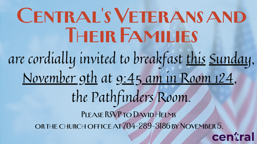 Are you or someone in your family a Veteran? We would like to honor all Central's Veterans THIS Sunday, November 9th with a breakfast at 9:45 am in Room 124, the Pathfinders Room.