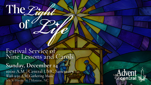 Come and be renewed with hope, peace, joy, and love as we celebrate the good news of the season in Worship for The Light of Life: A Festival Service of Nine Lessons and Carols on Sunday, December 14, 2025, at 10:00 A.M. in the Central UMC Sanctuary. Gathering music will begin at 9:50 A.M. Let this morning be a pause from the busyness of the season, a time to open your heart to wonder, reflection, and the radiant light of Christ.