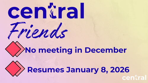 Central Friends will not meet in December. The next meeting will be January 8, 2026 at 12:00 PM in the Hospitality Room.