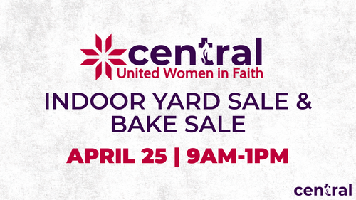 The United Women in Faith Indoor Yard Sale & Bake Sale is Saturday, April 25 from 9:00 A.M. to 1:00 P.M. in the Family Life Center. All proceeds will go towards Central's Missions. Hope to see you there!