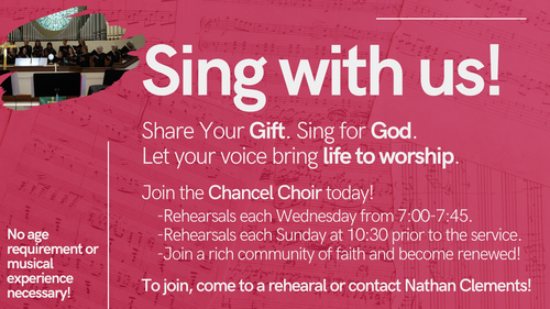 To be part of the choir, simply come to a rehearsal on Wednesdays from 7:00-7:45pm, on Sundays beginning at 10:30am, or contact Nathan Clements at clemnathanc@gmail.com. All rehearsals are held in the Choir Room.