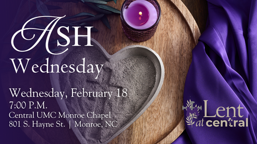Please join us as we begin the solemn, reflective season of Lent with an Ash Wednesday service on Wednesday, February 18 at 7:00 P.M. in the Central UMC Chapel.